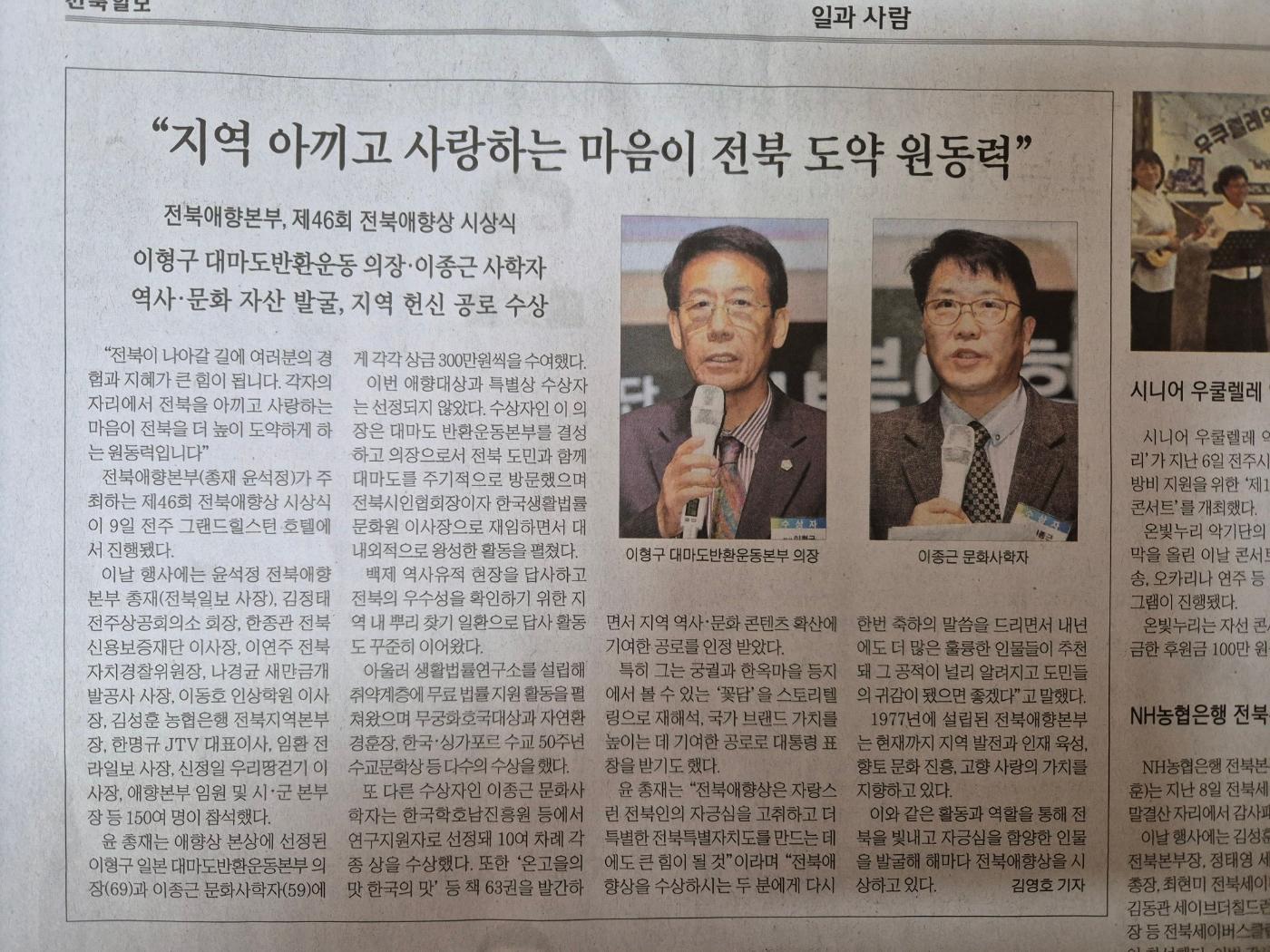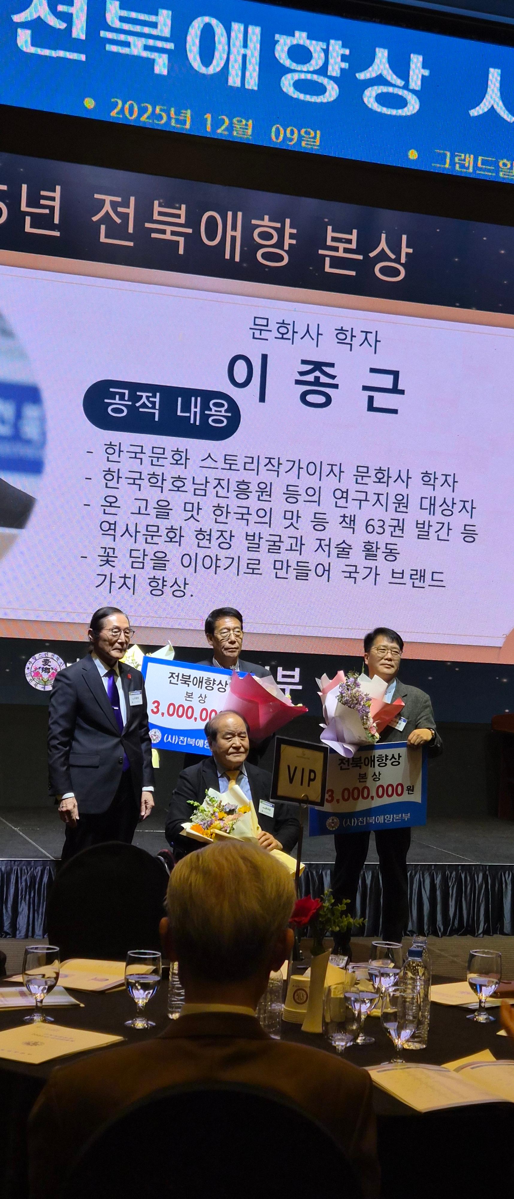 | 이종근 한국문화 스토리 작가, 오늘(9일) 제46회 전북애향상 수상 (1) | 2025.12.09 |