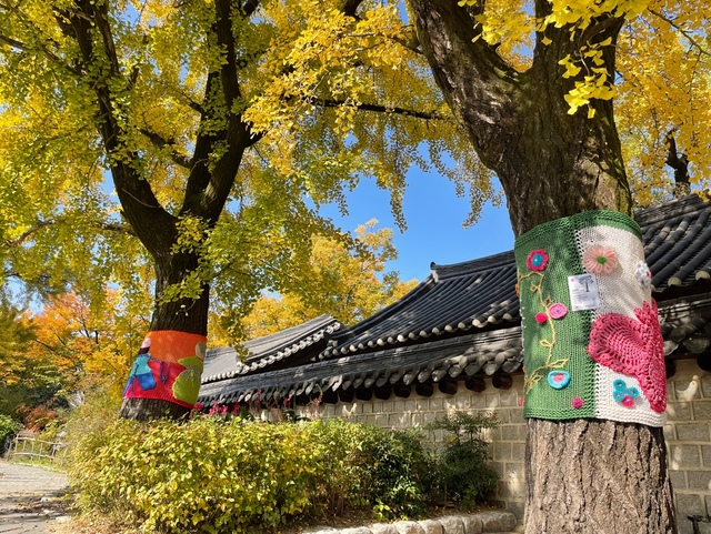 서울 종로구 사직단 인근 서촌 거리를 오가는 시민들의 눈길이 가로수에 머물렀다. 이파리가 떨어진 앙상한 가지 아래 몸통에 알록달록한 뜨개질 편물이 휘감겨 있었다.